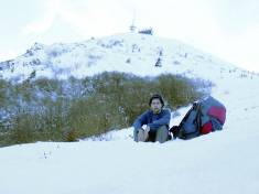 Vite 12h30, je mange un morceau, je prends les balises : 25-30 km/h d'ouest au puy de St Romain ! Le gros délire, des conditions idéales. J'arrive au pied du puy de dôme, et pour gagner du temps, je décide de monter par la face nord-est, par le chemin (de la taillerie) travers bois qui monte tout droit (la route est fermée en hiver car trop dangereuse). Me voila parti.... mais le sentier, qui est peu emprunté par les randonneurs vu sa raideur, était très difficile à repérer dans les bois et sous 40cm de neige. Je trace tout droit, et fini enfin par le retrouver en sortie des bois. Mais c'est là que les ennuis ont vraiment commencés : le manteau neigeux (poudreuse) était bien plus épais et recouvrait uniformément le relief, alors que ce versant est fait de bruyère avec des mottes et des trous...